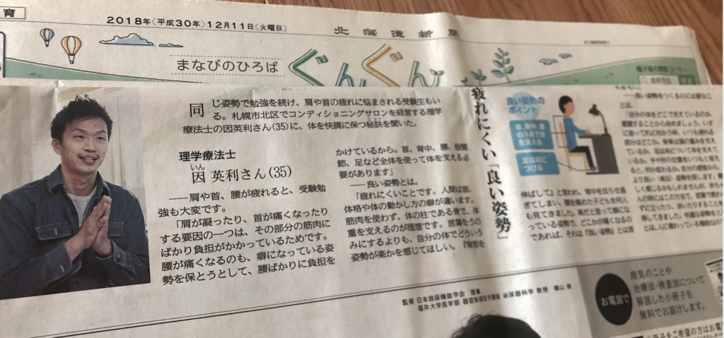 姿勢の専門家として、勉強中の姿勢について助言。結構大きく載り、道内の親戚中から連絡が・・